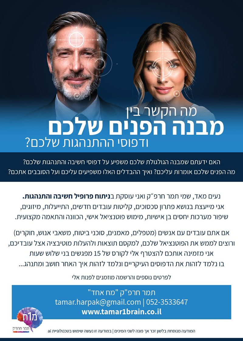 קורס מה הקשר בין מבנה הפנים שלכם ודפוסי ההתנהגות שלכם – בהנחיית תמר חרפ"ק